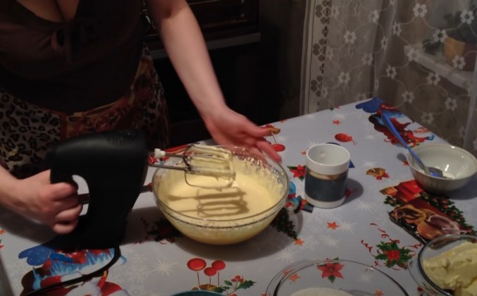 2. Минут за 20 разогрейте духовку до 200 градусов С. Уменьшите до 180. Ставьте бисквит. Печется 15-20 минут, смотрите по своей духовке, чтобы он у Вас не подгорел. Если духовка печёт слабо, поставьте под бисквит полный воды противень. По мере испарения подливайте воду: на пару он лучше подойдёт. Смотрите рецепт желе под видео! 150 мл прохладной воды разведите 50-60 г желатина, если очень жарко или 30, если холодно. Добавляем воды по чуть-чуть, чтобы желатин не плавал комочками. Отставляем постоять полчаса. Рецепт крема смотрите под видео. Тщательно отделяем белки от желтков из 10 яиц. Белки ставим в холодильник. Из желтков делаем заварной крем. Взбиваем желтки без ничего. Высыпаем сюда пакетик ванильного сахара. Кружка сахара нам нужна. Сахар вводим по 1 ложке. Взбиваем. Не нужно полностью растворять. Добавляем полную 1 ст.л. муки, перемешиваем. Стакан молока (200-230 г) по чуть-чуть вводим. Завариваем заварной крем. Выливаем в миску и ставим на водяную баню. Через 5 минут нужно помешать. Крем должен загустеть. Не должен кипеть. Поначалу он пойдёт комочками. Просто помешайте.