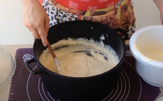 2. Добавляем понемногу муку, замешиваем тесто. Когда ложкой тяжело мешать, выкладываем на стол и вымешиваем. Если муку насыпать сразу всю, тесто будет твёрдым. Сыпьте понемножку. Тесто должно слегка липнуть к рукам. вмешиваем остальную муку. Тесто должно слегка липнуть к рукам. Вмешиваем остальную муку. Сделайте в тесте углубление, налейте растопленный маргарин. Теперь надо вымешать, все время вовнутрь. Тесто вобрало маргарин. Месить, пока не станет сухим.