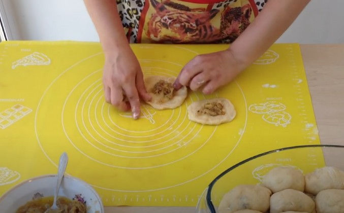 3. Если сильно липнет - добавьте немножко муки по чуть-чуть. Кладем подходить в 2 раза. Пока тесто подходит, будем делать начинку - любую. Тесто подошло. Берем кусочек теста, немножко растягиваем, вовнутрь кладём начинку. Слепляем по краям в серединку и кладём в форму. Сколотили 1 яйцо и немножко помажем, будет более выраженная золотистая корочка. Они немножко подойдут - и можно ставить в духовку выпекать.Видео рецепт ютуб ниже 👇
