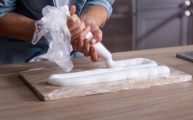 3. Выдавить колбаску из кондитерского пакета по всей площади доски в виде змейки. Отправить доску с маршмеллоу в холодильник на 2 часа. Доску с застывшим мармеллоу посыпать небольшим количеством сахарной пудры. С помощью ножниц нарезать кусочки маршмеллоу и обвалять в сахарной пудре со всех сторон. Переложить маршмеллоу в глубокую тарелку.Просто Кухня рецепты с 2020-2022