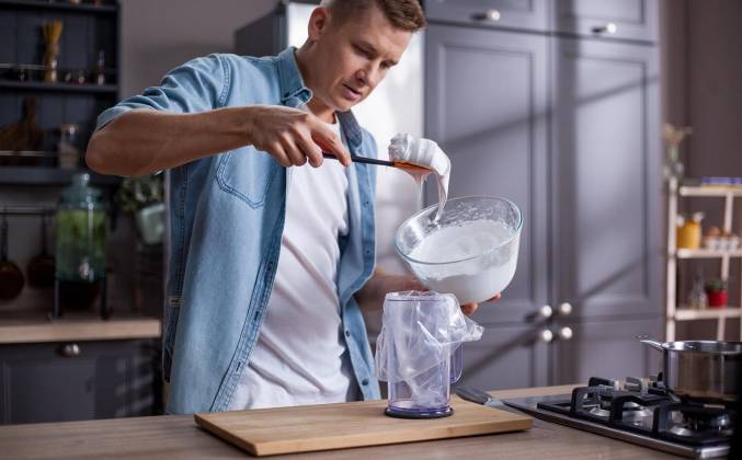 2. Добавить в середине взбивания около 10 капель лимонного сока. Совет от шефа: Взбивать сахарный сироп с желатином нужно до белой и плотной консистенции В кондитерский пакет переложить полученную массу и передвинуть к уголку пакета. Отрезать кончик. Совет от шефа: Отверстие в кондитерском пакете должно быть чуть больше, чем размер стандартного маршмеллоу, так как при застывании оно слегка уменьшится в размерах. Доску обмотать пищевой плёнкой и смазать с одной стороны 10 мл растительного масла.