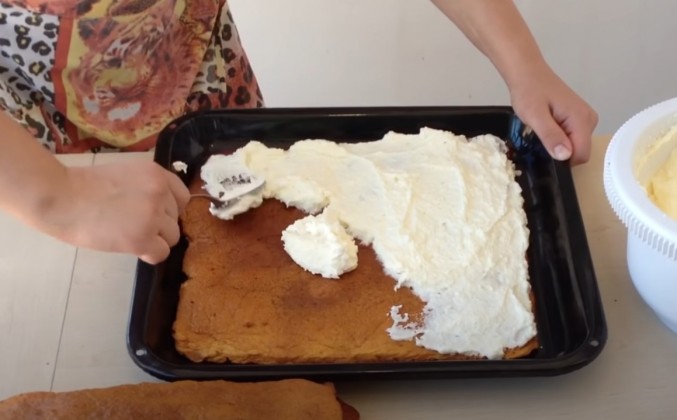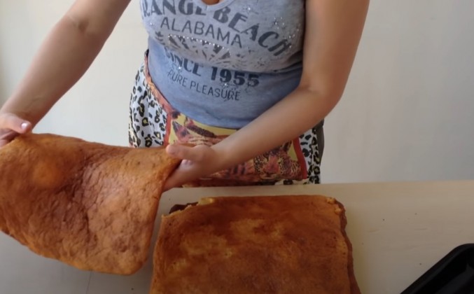 2. Если тесто плохо перебродит, оно будет плохо подниматься. Берем бумагу для выпечки по форме противня. Берем самый большой нож. Кладем на лист пергамента 1 ст. ложку теста. Растягиваем тесто во все стороны по листу. В толщину – о 2 до 5 миллиметров. Поставьте лист в духовку, разогретую до 200 градусов С. Уменьшите до 130 градусов. Печется быстро - по 5, потом - по 2 минуты. Мы вынули его из духовки. Поддели лопаткой. Пусть остынет минуты 2. Переверните. Снимите бумагу. У нас получилось 4 коржа на квадратном противне. Коржи получились пузыристыми, пахнут мёдом. Если поднялось волнами – это тоже нормально. Если противень слишком длинный – сделайте двойную норму теста. Чем меньше форма, тем коржи выше.