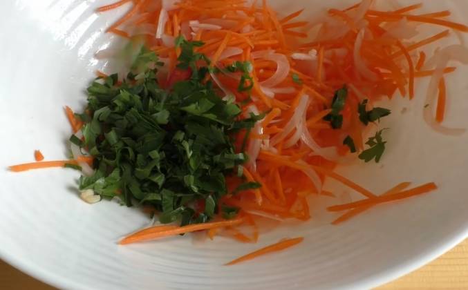 2. Мне как-то в комментариях кто-то смеялся - как в воде можете влага уйти. На самом деле - может, потому что здесь вода соленая, в клетках вода не такая соленая. Под воздействием осмотического давления, я знаю даже так умное слово, жидкость лишняя выходит, влага из клеток. Поэтому, баклажаны сейчас отжимаем. Вот, видите, какие они. И обжариваем их в растительном масле до готовности. В отдельной чашке соединяем морковь небольшую, натертую на корейской терке. Здесь же лук. Можно его нарезать ломтиками, можно полукольцами. Сюда же добавляем чеснок 2-3 зубчика, уксус - полторы чайной ложки, у меня винный 6%, небольшая щепотка соли - помним, что баклажаны мы уже солили. И одну чайную ложку без верха сахара. Все это перемешаем, можно даже руками. Так, чтобы все хорошо распределилось. Добавляем острый перец по вашему вкусу.