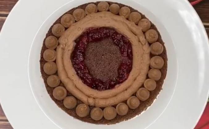 4. Для сиропа соединяем все ингредиенты в сотейнике, ставим его на плиту, доводим до кипения и кипятим пару минут. Убираем сироп в холодильник. Пропитывать бисквит надо только холодным сиропом. Остывший бисквит разрезаем на три равные части, каждую часть пропитываем сиропом, при помощи кондитерского мешка отсаживаем на бисквит крем и конфитюр как показано на видео. Убираем торт в холодильник на 2 часа и далее украшаем по желанию.Видео рецепт ютуб ниже 👇