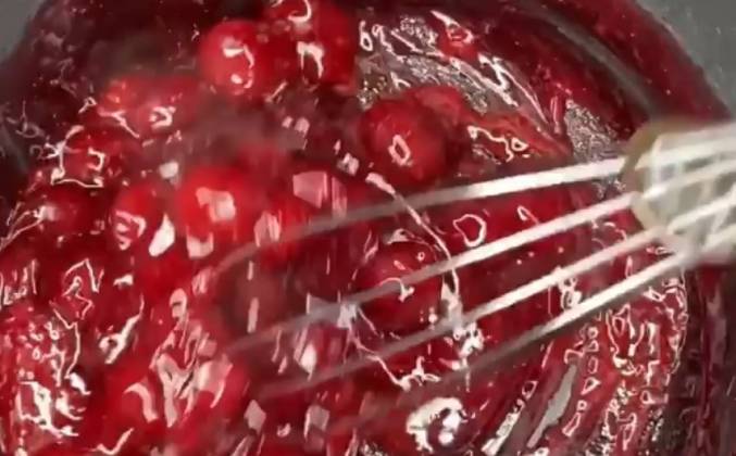 3. Для конфитюра соединяем все ингредиенты в сотейнике, перемешиваем, ставим на плиту. Масса должна закипеть (периодически помешиваем). После этого увариваем его секунд 30 до загустения. Далее даем конфитюру остыть при комнатной температуре, накрываем плёнкой в контакт и убираем в холодильник часа на 3-4, чтобы он лучше застыл.