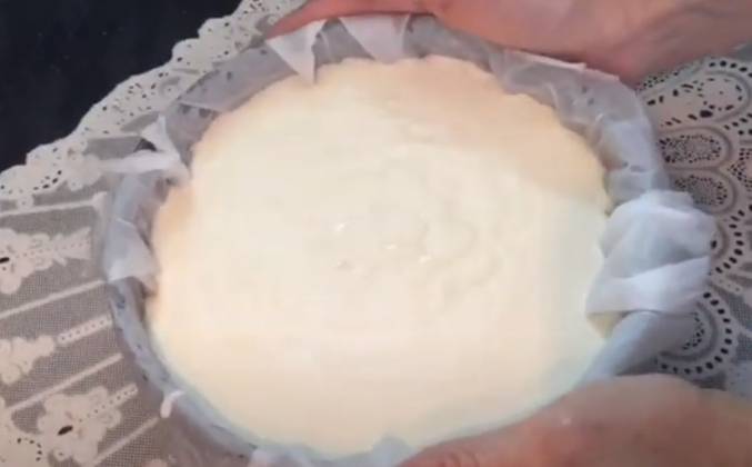 2. Затем берём съемную форму, застилаем пергаментном (можно его смочить, чтобы он хорошо ложился, можно и не смачивать), выливаем тесто, немного постучим, чтобы вышел воздух и ставим запекаться в духовку на 40 мин при 210 гр. Если вы хотите более влажный чизкейк, то выпекаем 30 мин, ориентиром будет то, что середина чизкейка должна немного колыхаться, когда будете вынимать из духовки.