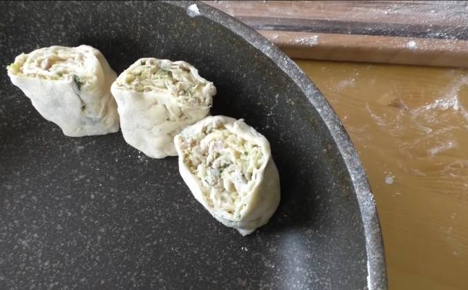 3. Заворачиваем плотненький рулет. По всей длине. Рулет нарезаем вот на такие кусочки и выставляем прям в сковороду. Наливаем немного воды кипящей, друзья. Буквально пол сантиметра, чтоб покрывала дно. Накрываем крышкой и кипятим минут 5. Должны мы тесто наше тоненькое пропарить. Вот такие они через пять минут. Смотрите, как они уже пропарились. Еще на одной сковороде растопил сливочное масло и отправляем их сюда. Обжариваем дно до золотистого цвета. Вот так чудесно у нас с вами получилось и очень вкусно! Друзья, обязательно пробуйте этот рецепт! Вот такие они внутри. Всё отлично пропарилось, приготовилось, прожарилось. Будем готовить и наслаждаться!Видео рецепт ютуб ниже 👇