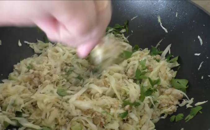 2. У нас будет вот такая вот капустно-мясная начинка. Обжариваем. Минут 20. Добавляем капусту и тушим до готовности. Начинка практически готова. Друзья, все-таки хорошо, что тесто мы завели чуть пораньше. Если бы не тесто, я бы уже начинку съел и все, и забыл бы. Добавил немного перца, теперь - хорошая щепотка соли. И ещё добавлю зелени - прям вот так вот петрушечку крупно порублю, добавлю. Перемешиваем и выключаем. Друзья, вот до готовности самой начинки осталось минут пять. Все, достаточно. Теперь надо остудить. И когда начинка уже остынет, и ее пока ещё не всю съели, берем тесто, припылим стол мукой и раскатываем в тонкий пласт. Всю начинку распределяем по тесту. Чтобы равномерно и в каждом кусочке у нас была вкусная капуста и фарш.