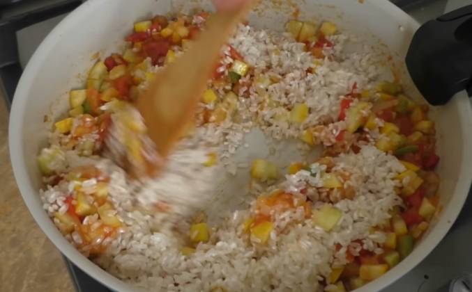 2. Овощи режем кубиками, добавляем к луку и пассируем еще пару минут на сильном огне. Летние овощи и сами по себе очень яркие, но я добавлю еще пол чайной ложки смеси карри. Она придаст рису красивый оттенок, ну и аромат всему гарниру. Сейчас самое время добавить сюда стакан промытого риса. Я беру рис для плова. Но здесь может подойти любой рис, каким вы привыкли пользоваться. Краснодарский, кстати, тоже очень хорош. Хорошенько все перемешиваем. Дадим рису пропитаться вот этими соками. Это буквально займет пару минут. Добавляем соль и пару стаканов воды. На этом этапе гарнир снимаем с огня. Убираем ручку, вот, кстати, сразу рекомендую использовать сковородку, которую потом можно поставить в духовку. Накрываем сверху фольгой.