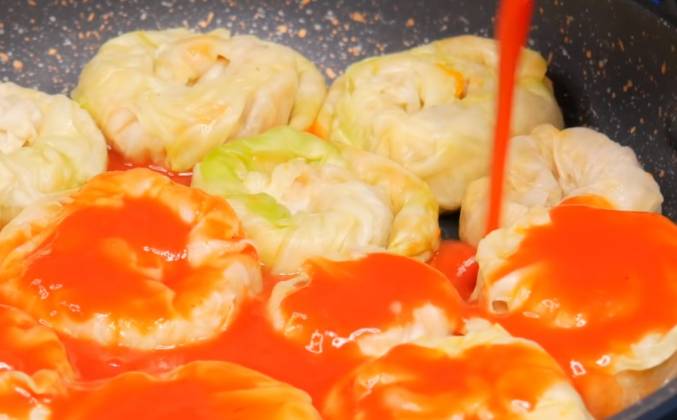 3. С одного края она чуть толще, а с другого тоньше. Теперь с той части, где она чуточку толще аккуратно сворачиваю голубец в форме улитки. Таким же образом формирую все голубцы и выкладываю в глубокую посуду, в которой будут голубцы готовиться. Это может быть сковорода-сотейник или кастрюля. Для соуса я взяла уже готовые протертые томаты, добавила к ним немного соли и воды. Заливаю томатным соусом голубцы.
