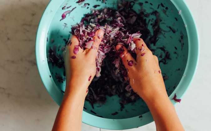 3. Чистыми руками положите смесь квашеной капусты в стерильные банки и плотно прижмите, чтобы утрамбовать. От массажа салата должно быть достаточно жидкости, чтобы подняться и покрыть овощи. Если этого не происходит, долейте фильтрованную воду до тех пор, пока она не будет покрыта (маловероятно, что вам нужно будет добавлять воду). Кроме того, убедитесь, что между содержимым и крышкой достаточно места (около 15-2 см), чтобы в ней было место для расширения. Запечатайте крышкой и установите на стойку, где не так много прямых солнечных лучей или в шкаф. Идеальная температура для брожения выше 18 C, поэтому старайтесь держать банку в теплом месте, чтобы обеспечить правильное брожение.
