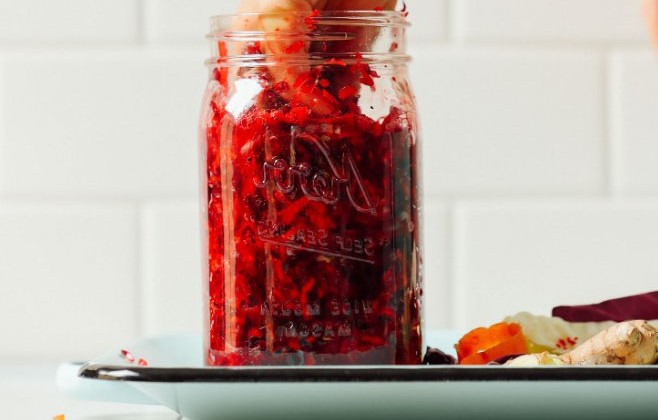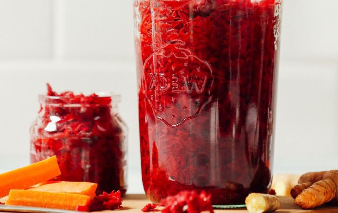 2. Добавьте измельченную свеклу, морковь, имбирь, куркуму и чеснок и еще раз помассируйте чистыми руками в течение 4-5 минут до полного смешивания. Затем попробуйте вкус и откорректируйте его, добавив больше соли для солености, тертый имбирь для большего количества перчености или чеснок для более интенсивного вкуса чеснока.