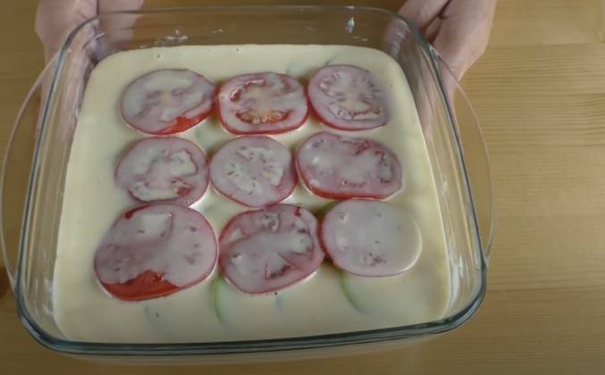 3. На фарш выкладываем кружочки кабачка. Я взяла цукини потемнее и посветлее. Вот кабачки, нарезанные кружочками, они придадут структуры, то есть не будет все вот такой вот, как кашей. Будет очень даже хорошо. Чувствоваться кабачок точно будет. Кружочки помидоров добавят одновременно и легкую кислинку, и немного сладости нашему блюду. Приготовим заливку. В 2 яйца мы добавим 4 столовые ложки сметаны, я беру 10%, можно даже взять йогурт. Хорошенько все перемешиваем. Аккуратно сверху заливаем заливку. Отправляем запеканку в духовку, разогретую на 180 градусов, на 35 минут.