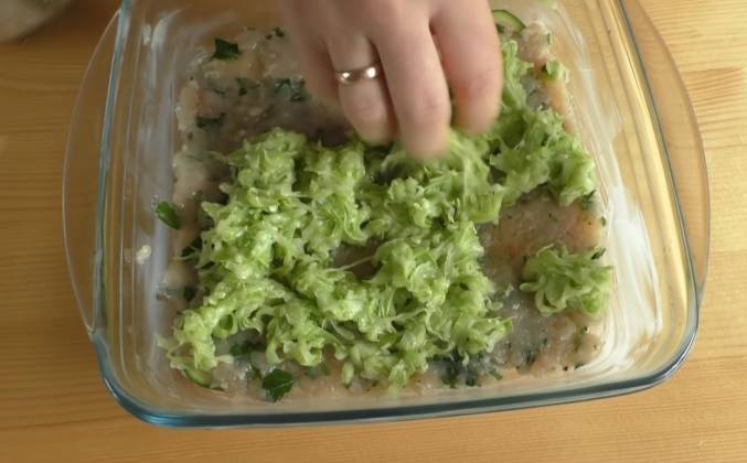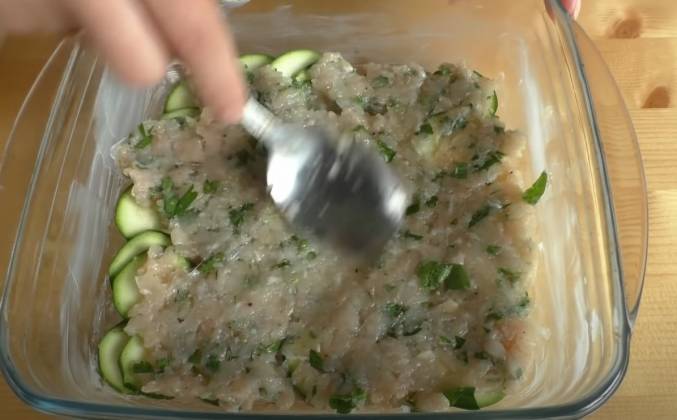 2. И конечно же, хорошую щепотку зелени, я взяла петрушку, которую крупно порезала, лето все-таки. Все хорошо перемешиваем. И у нас ароматный фарш готов. У меня кабачок наисвежайший, буквально 5 минут как с огорода, да к тому же у нас несколько дней были дожди, поэтому посмотрите, какой он сочный. Сейчас я его хорошенько отожму и уберу лишний сок. Второй кабачок я нарезала тонкими кружочками. И выкладываю его на дно формы. Форму предварительно смазала сливочным маслом. Сверху распределяем слой фарша. Толщина слоя где-то примерно пол сантиметра. Размер моей формы 20 на 20 сантиметров. Дальше – слой кабачка. Вот этот натертый кабачок, он придаст нежности, воздушности нашей запеканке. Сверху опять слой фарша.