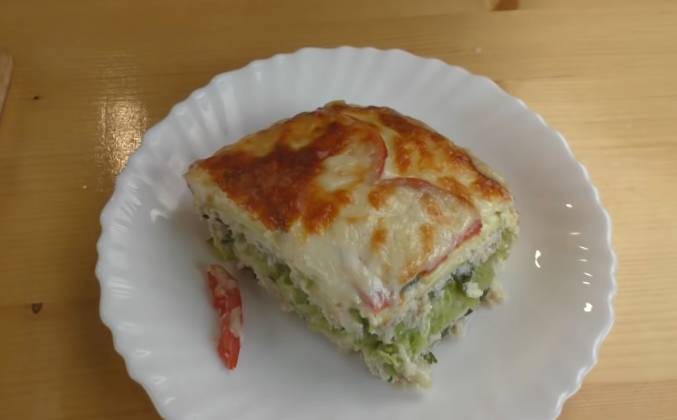 4. Отлично все запеклось! Друзья, можно ещё подержать духовке минут пять. Или добавить немного сыра и поддержать уже вместе с ним. Пусть сыр расплавится вот так, растечется по запеканке, будет очень вкусно! Отправлю в духовку еще буквально на 5-7 минут. Сыра добавила около 100 граммов. Фантастически красивая запеканка получилась! Отрезаем кусочек, достаем и наслаждаемся, друзья! Посмотрите, какая чудесная запеканка! Все слои пропеклись, но очень нежные! При этом не сухие. И сверху вкусная, аппетитная корочка! Вот такое простое, сытное, но очень легкое блюдо мы с вами приготовили. Готовьте на здоровье, угощайте своих друзей и сами угощайтесь!Видео рецепт ютуб ниже 👇