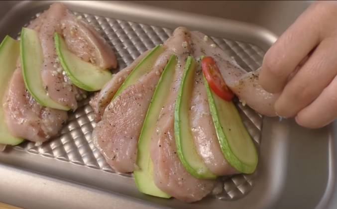 3. Я уже подготовила овощи, и будем их закладывать в наш веер. Кабачки, ну тоненькие, ну буквально пару миллиметров. Посмотрите, уже какая картина вырисовывается! Одного небольшого кабачка на две грудки вполне хватит. Теперь тонкие кружки помидоров. Обязательно тонкие, если мы сейчас толстые сюда помидоры положим, то они дадут много сока, кабачок и так даст сока, не переживайте. И поплывет наша грудка, будет больше даже варится. А нам нужно, чтобы она и не жарилась, больше томилась. А чтобы вся эта конструкция стала такой вот единой, между кусочками курицы выложим еще пластики сыра. Я беру сыр, который хорошо плавится. Беларуская моцарелла, она недорогая.