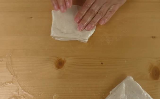 3. Тесто очень эластичное, тянется хорошо. Просто разглаживайте его. Растягиваем до прозрачности. Мы должны через тесто увидеть столешницу. Ну вот мне даже чуть-чуть порвалось, это не страшно. Хорошо растягиваем не только края, но и середину. Видите, какое оно эластичное. Слегка посыпаем манкой с разрыхлителем. Чуть-чуть. И сворачиваем. Вот такие заготовочки. Продолжаем со всем остальным тестом. Осталось только сделать наши лепешечки чуть потоньше и можно обжаривать. Обжариваем лепешки на горячей сухой сковородке. Благодаря разрыхлителю, лепешки станут еще воздушнее. Они невероятно слоёные и очень вкусные! Если хотите, можно сразу слоить с сахаром, тогда они будут сладенькие.
