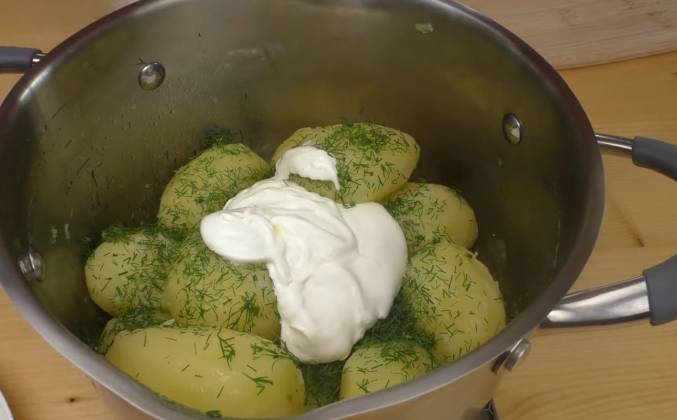 3.  И сюда же добавляем сметану. Сделаем и хорошо-хорошо потрясем. Сметана должна разойтись с укропом по всей картошке. Вот такая финская картошечка у нас сегодня получилась. Финны подают ее и с рыбой, и с мясом. Ну вот она и курочка здесь отлично подходит. Смотрите, насколько все сочные! Обалдеть! Других слов у меня просто нету. Ну и сама картошечка, смотрите. Это что-то! Она ароматная, вкусная – ну конечно же, я попробовал. Сливочно-сметанный вкус, мама дорогая! Обязательно готовьте! Все очень легко и просто! И невероятно вкусно!Видео рецепт ютуб ниже 👇