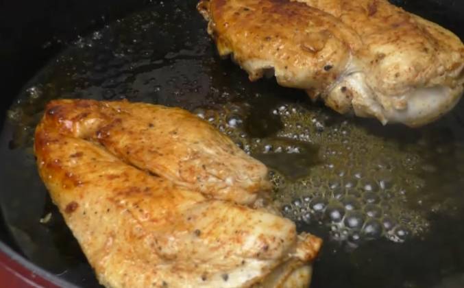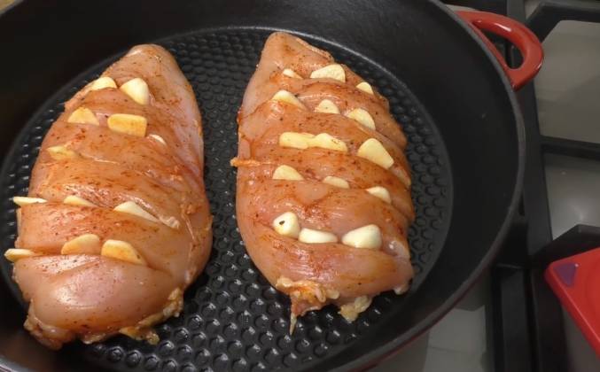 2.  Вот такая фаршированная грудка у нас получается. Грудки отправляем на сковороду. У меня вот такая чугунная. Сверху польем маслом. Ну и пускай на дно попадет. И добавляем воду. Накрываем крышкой и тушим на среднем огне 20 минут. Просто волшебная курочка получается. Друзья, сейчас я вам покажу. Вот такая корочка снизу образовалась. Еще несколько минут обжарим с чесночной стороны. Курочка готова. И картошечка, друзья, тоже подоспела. Я ее слил, слегка обсушил, прямо на плите и теперь добавил сливочное масло. Вот так встряхну, пускай масло растворится и обволакивает каждую картошечку. Грудка пока отдыхает, в картошку добавляем мелко порезанный укроп. Друзья, это что-то! Это просто шедевр!