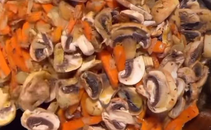 2. Закрываем крышкой и даем моркови с луком подружиться и секунд 30, теперь открываем крышку и перемешиваем, жарим все вместе еще минута две и добавляем специи, одну пачку смеси перцев, оставшийся базилик, оставшуюся приправу к плову, немного острой паприки, примерно половину чайной ложки соли, добавляем по вкусу примерно 2 чайные ложки, жарить до готовности лука и моркови, теперь когда лук с морковью готовы добавляем грибы, полтора килограмма и порезанные на пластинки, не перемешивая.