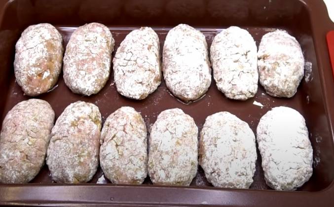 3. Берем немного фарша и формируем котлеты, из данного количества ингредиентов у меня получается 12 котлет, теперь обваливаем в муке и кладем на противень, ставим в разогретую духовку и запекаем при 200 градусах 20-25 минут, за это время приготовим соус.