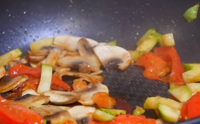 2. Подрумяним их буквально пару минут. Разбиваем два яйца, немного солю, взбалтываю и добавляю молоко. Вилкой еще немного взбиваю омлетную массу и выливаю ее в подходящую форму для запекания. Туда же кладу обжаренные овощи и грибы. Отправляю форму в духовку разогретую до 180 градусов на 15 минут.