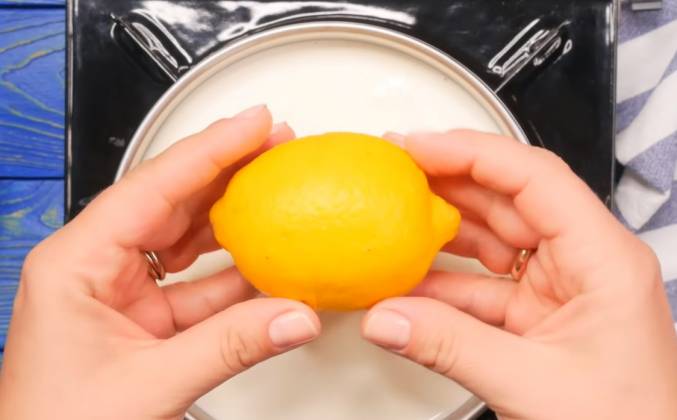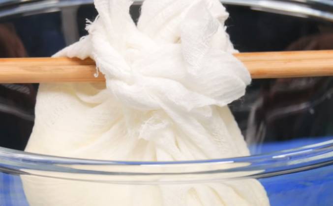 2. Если у вас есть термометр, то нагревать сливки нужно до температуры не более восьмидесяти пяти градусов. Я грела до того момента, когда стало видно, что смесь вот-вот закипит. Огонь сразу же выключила, но смесь лежала в горячей кастрюли еще 3-4 минуты постоянно помешивая. Теперь нужно ее отцедить. Для этого использую небольшой дуршлаг и хлопчатобумажное полотенце, либо марлю. Края полотенца собираю вверх, чтобы получился мешочек. Такой мешочек нужно подвесить на час, чтобы стекла лишняя сыворотка. Очень удобно это делать привязав мешочек к большой ложке или к палочкам.