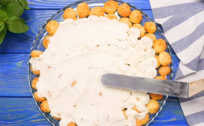 4. Я сделала на большом блюде, чтобы получилось некое подобие тортика. Конечно же можно такой десерт сервировать порционно. Первым слоем выкладываю все профитроли, а сверху ровным, достаточно тонким слоем, распределяем крем с маскарпоне. На час убираю десерт в холодильник.