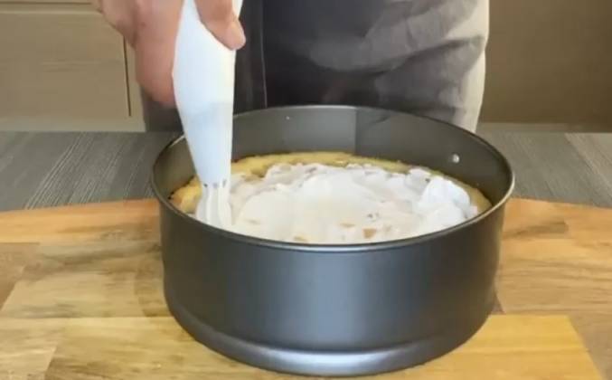 3. Здесь вы можете проявить свою фантазию - сделать красивые пики из меренги, воздушные волны, красивые штрихи и т.д. Ставим пирог в духовой шкаф при температуре 160° на 15-20 мин. Сверху образуется корочка - значит пирог готов. Завариваем чай и наслаждаемся!