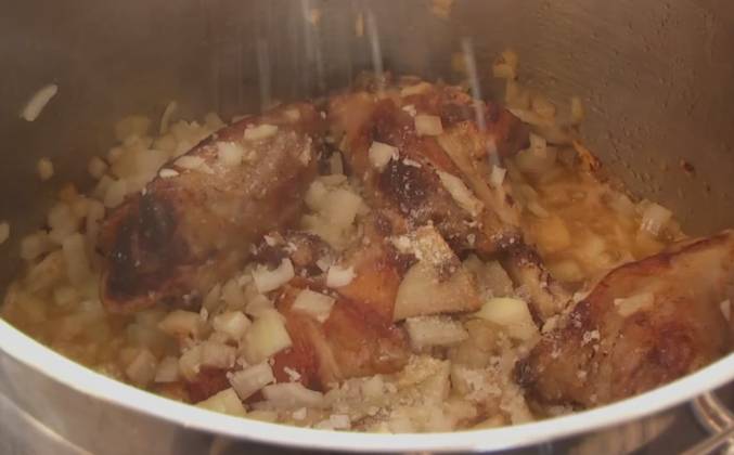 2. А теперь нарезаю в нужный мне размер. Вообще лук один из самых необходимых продуктов для тушения любого мяса. При длительной совместной готовке мясо под воздействием луковых соков размягчается и пропитывается ими, а луковая мякоть естественным образом превращается в бархатистый соус. Однако вернемся к нашему барану. Добавим лук. На сильном огне обжарим его. И оставим тушиться под крышкой до мягкости баранины. Приправим солью, перцем. Розмарин! Какая же баранина без розмарина?! Теперь у нас есть примерно час свободного времени. Если ваша чечевица из разряда долгоиграющих - самое время её промыть и залить водой. Так, ну что тут у нас? Ножки уже сейчас можно есть, но мы готовим баранину с чечевицей!