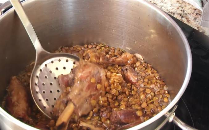 3. Добавим её и перемешаем. В конце концов мы хотим получить такое блюдо, в котором мясо легко отделяется от костей, а чечевица мягкая, но не потерявшая форму. Поэтому доливаем бульона или воды на два пальца выше чечевицы, даём закипеть, накрываем крышкой и оставляем тушиться до готовности. Когда чечевица развариться и пропитается всеми ароматами, выправим блюдо на соль, расставим тарелки и распахнём двери для пришедших с мороза старых друзей.Видео рецепт ютуб ниже 👇