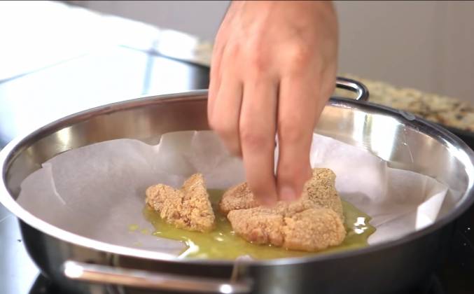 2. Пока масло греется, запанирую курицу в сухарной крошке. Самая неприятная проблема в том, что панировка частично осыпается И начинает гореть на дне сковородки. Это придаёт продуктам неприятный вкус когда мы кладем на сковородку бумагу она работает небольшой прослойкой между панировкой и дном. И всё горит значительно меньше. Бумага в продаже бывает разная. Одна пропускает жиры, другая нет. Если ваша бумага жир не пропускает, то перед тем, как класть бумагу на сковородку, нужно плеснуть ложку масла на дно, а потом уже класть бумагу. Однако продолжим. Куриную грудку очень легко пересушить, поэтому необходим постоянный контроль. Придавите пальцем сырой кусочек мяса и оцените его мягкость и упругость.