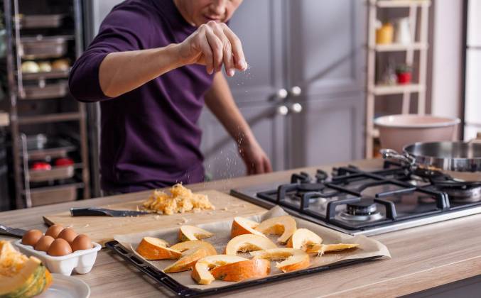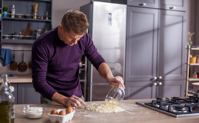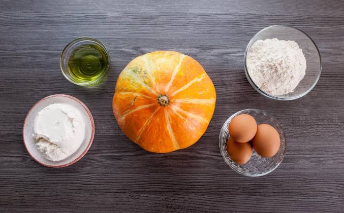 2. Добавить в тесто 15 мл оливкового масла, 2 ч. ложки белка и продолжить замешивать. Активно замесить тесто: подогнуть, затем запястьем надавить и вытянуть вперёд, а затем опять подогнуть. И так несколько раз. Тесто скатать в комок, обернуть пищевой плёнкой и убрать в сторону — через 25 минут тесто будет готово к работе. Когда готовая тыква остынет, удалить кожицу и переложить в отдельную миску. Оставить 1 дольку тыквы для украшения. Протереть тыкву с помощью вилки.