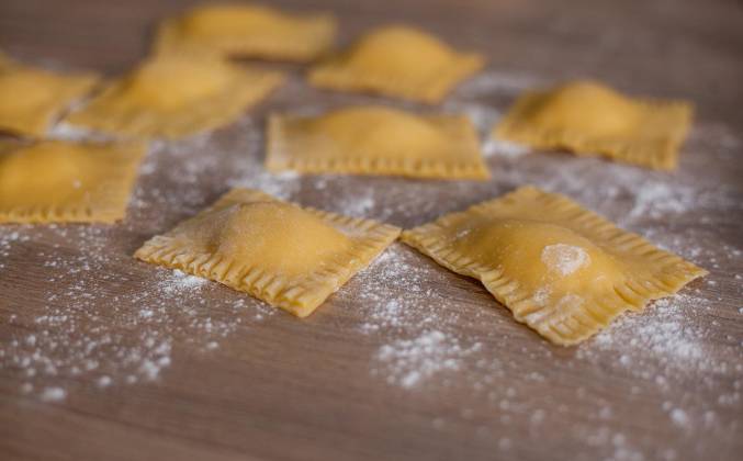 3. Добавить рикотту, посолить 1 щепоткой, поперчить по вкусу, перемешать и отправить в холодильник. На стол насыпать немного муки и одну часть теста раскатать в тонкий пласт. Выложить начинку по 1 ч. ложке на расстоянии 2-3 см на одну половинку пласта и накрыт другой половинкой. Пальцами надавить на промежутки между начинками и разрезать (отделить) на квадратики. Вилкой закрепить края. Совет от шефа: Обязательно нужно убрать лишний воздух.