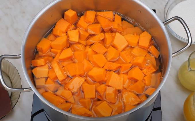 2.  Берем кастрюлю, объемом не менее 8-10 литров, складываем в нее крупно нарезанные яблоки и тыкву, порезанную произвольными кусочками. Устанавливаем кастрюлю на плиту и заливаем тыкву с яблоками водой с таким расчетом, чтобы они полностью ею покрылись - мне понадобилось 3 литра воды. 3.  На большом огне доводим до кипения, убавляем нагрев и под крышкой варим до мягкости тыквы, периодически снимая образовавшуюся пену. Как правило, на это уходит 15-20 минут. По большому счету, этот рецепт - сплошная импровизация. Помимо тыквы, в такой нектар кроме яблок можно добавить морковь, свежие или замороженные абрикосы и персики, курагу, облепиху, цедру лимона или апельсина, а вместо воды заливать тыкву соком любых вышеперечисленных фруктов.
