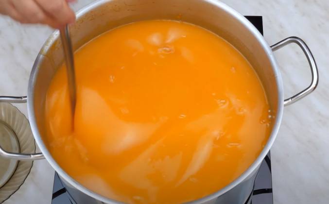 4.  Как только тыква с яблоками станут очень мягкими, выключаем плиту и пробиваем массу погружным блендером до однородного состояния. Вместо блендера можно воспользоваться очень мелким ситом и протереть продукты через него. На данном этапе попробуйте напиток на вкус и в зависимости от сладости тыквы и яблок, добавьте по вкусу сахар, а если вы не приветствуете сахар или готовите для диабетиков, то его можно и вовсе не добавлять. 5.  На 7 литров напитка мне понадобилось 700 г сахара. В качестве консерванта добавляем в нектар сок двух лимонов, а для вкуса сок трех больших апельсинов. Все хорошо перемешиваем до растворения сахара. Вместо лимонного сока можно взять сухую лимонную кислоту, а вместо апельсинового - мандариновый сок. Снова доводим напиток до кипения, снимаем образовавшуюся пену, кипятим 5-10 минут и можно разливать по банкам.