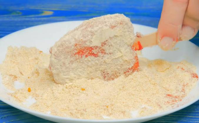 3. Через 30 минут наггетсы-эскимо из морозилки вынимаю. Каждый промазываю с двух сторон тонким слоем Томатной пастой. Для панировки я взяла кукурузную муку и смешала ее с куркумой и паприкой. Обваливаю свои заготовки в панировке со всех сторон. Лишнюю муку обязательно стряхиваю. Наггетсы готовлю, в разогретой до 180 градусов, духовке 25 минут. А пока они запекаются сделаю очень простой соус. К греческому йогурту добавляю щепотку соли и измельченный укроп. Ну вот и мои красавчики нагетсы готовы.Видео рецепт ютуб ниже 👇