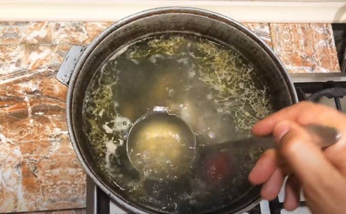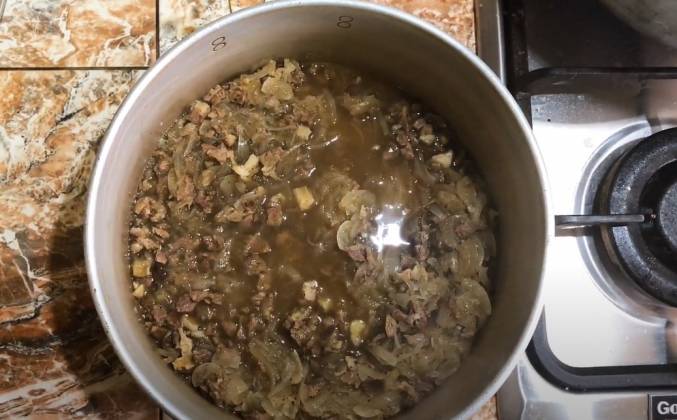 2. Готовое тесто уберем отдохнуть на 40 минут. Когда бульон свариться, приготовим соус. Лук нарежем мелко. Переложим в металлическую посуду либо казанок, добавим чайную ложку молотого черного перца. Нальем сверху 0,5 литра готового бульона. Поставим на средний огонь, когда бульон закипит, убавим огонь до минимума и будем томить пока лук не станет мягким и не отдаст в соус все свои ароматы и вкус. ЛУК В ПРОЦЕССЕ ТОМЛЕНИЯ ДОЛЖЕН СТАТЬ ТЕМНОГО ЦВЕТА!!!