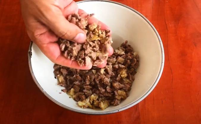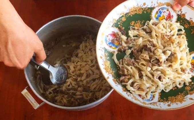 5. Теперь к этому луково - мясному соусу добавляют отваренное тесто, все еще раз перемешивают. Готовый Бешбармак выкладывают на широкое плоское блюдо, сверху добавляют Казы или Чучук (колбаса из конского мяса и жира), по желанию добавляют Карта (отварная жирная конская кишка). Приятного аппетита!!!Видео рецепт ютуб ниже 👇