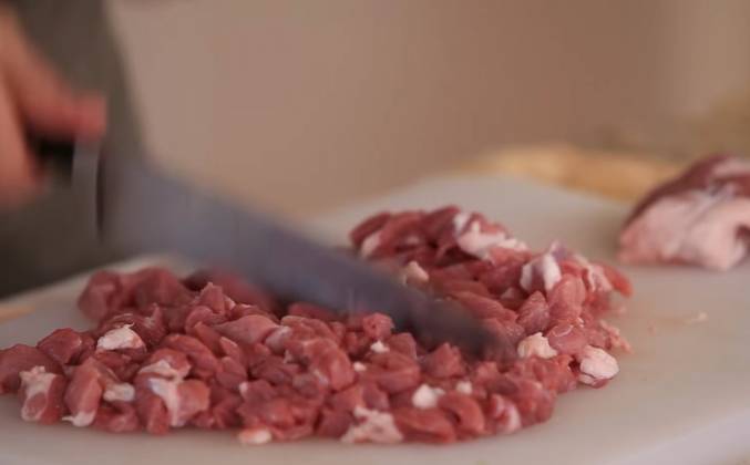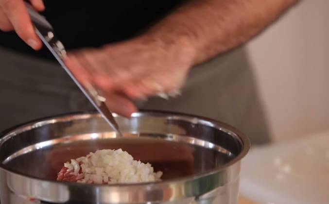 4. Ещё одна тонкость - фарш для таких блюд нужно всегда стараться получать настолько сочным, насколько это вообще возможно, но чтобы при этом фарш всё ещё не тёк. Так вот для вкуса в мясо я добавляю лук. НО! Лук я ни в коем случае не пропускаю через мясорубку или блендер! Эта луковица содержит в себе примерно 150 мл сока. Если я пропущу её через мясорубку или измельчу в блендре, то в фарш я смогу добавить как раз на эти 150 миллилитров воды меньше. А если луковица будет порезана мелкими кубиками - то эти кусочки лука будут удерживать в себе весь свой сок и я смогу добавить в фарш столько воды, сколько захочу. Пока он нарезан острым ножом мелкими кубиками весь луковый сок содержится в этом кубике. Но лук надо резать действительно мелко, иначе за время варки он просто не успеет размягчиться и в фарше будут попадаться цельные кубики лука - а это не всем нравится.