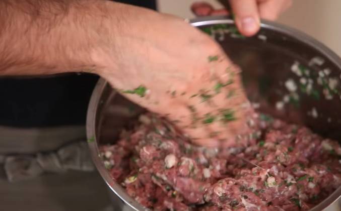 5. Мяту и кинзу я тоже мелко порублю. Грузинская кухня немыслима без кинзы, да и вообще без огромных пучков пряной зелени. А теперь все смешиваю, лук, зелень, соль. Смотрите какой фарш получается. Ещё немного воды и он бы уже потёк Размеры хинкали зависят от вашей хлебосольности и аппетита ваших гостей. Некоторые грузинские повара считают что хинкали только тогда хинкали, когда одним хинкали можно расплющить ногу, если уронить его. Я к таким ортодоксам не отношусь и буду лепить такого размера, чтобы мои дети могли хинкали поднять. Есть разные способы раскатки лепешек. Я хочу опробовать вот такой старинный грузинский. Правда для них нужна деревянная формочка, а у меня только железное кольцо. Но, буду надеяться, что и с ним все получится.