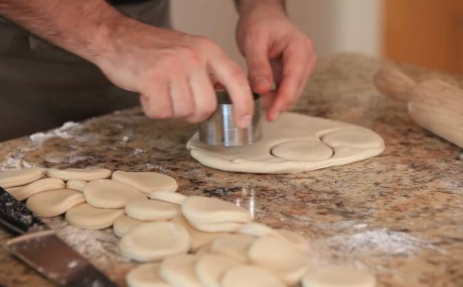 6. Для начала я раскатываю тесто до толщины примерно в сантиметр А теперь вырезаю кружки. Остатки теста собираю и опять раскатываю. И опять режу. И так до победного конца Теперь осталось раскатать. Тут тоже не все так просто. Тесто для хинкали раскатывают не в пример толще, чем для уральских пельменей например. Потому что, размерчик у хинкали взрослый, едят их руками, поднимая за хвостик и тонкое тесто просто порвется. Не знаю как вы, а я уже проголодался, поэтому прежде чем собирать хинкали, поставлю кипятиться воду для них и сразу посолю! Выберу самую большую кастрюлю в доме. Наступает кульминационный момент! Я начну делать то, что раньше никогда не делал! Вернее делал, только в тот момент я думал, что собираю манты. Обратите внимание на способ защипывания хинкали. Собираю вот такие складки и прищипываю. А вот теперь, этот конец зажимаю очень плотно, проворачиваю и отрываю. Нет, не нравится мне такая манера сборки - столько теста в отход идёт. Внимание- монтаж Все хинкали слеплены - отправляю их в кастрюлю. Им должно быть просторно.
