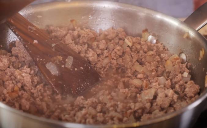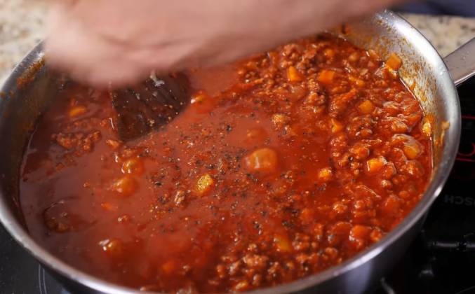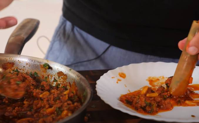2. Это следы реакции майяра. Вот вином и бульоном я их и растворяю. Это добавит яркости начинке. А для дополнительной сладости надо нарубить сладкого перца. Он еще и своего оригинального вкуса добавит. Отлично! И теперь уже можно... Да, уже можно добавить сладкий перец и томатную пасту. Тут очень важно выбрать вкусную. Если такой не нашлось, придется доводить до вкуса, колдуя с добавками, ну, там соль, может быть сахар, может быть кислота в виде лимонного сока или винного уксуса. Короче, именно на этом этапе надо придать вкус мясной начинке, именно тот, который вам нравится! Вы же для себя готовите. Мне вот однозначно придется добавить черного перца. Перемешать и можно даже не пробовать, так как именно вот с этой пастой готовлю начинку постоянно. Все. Остается добавить кедровые орешки. Ну, а в моем случае орешки пинии.