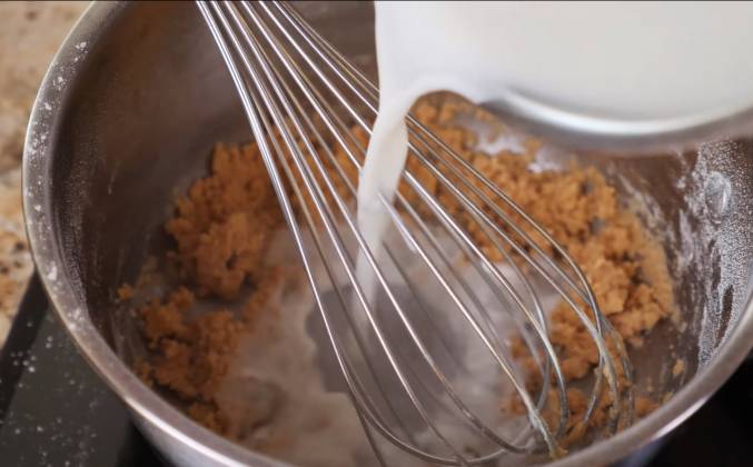 4. Без ароматизированного молока вы, конечно, получите нормальный соус, нормальный по консистенции, по текстуре. Но он будет практически безвкусный. Именно ароматизация и создает то самое волшебство вкуса, за которое бешамель так любят французы. Греть молоко с вот этими добавками нужно минут 15-20 на очень слабом таком огне, при очень слабом кипении. Все, молоко уже ароматное. Можно из него все лишнее удалить. И пора продолжать. Сначала обжарка муки на сухой сковороде до такого светло-кремового цвета, помешивая. Как только дождались орехового аромата, кладем масло. И так энергично мешаем до однородности. И вот теперь по частям вмешиваем молоко. Следующую часть молока надо добавлять не раньше, чем предыдущая полностью перемешается до полной однородности. И это - главный секрет бешамеля без комочков.
