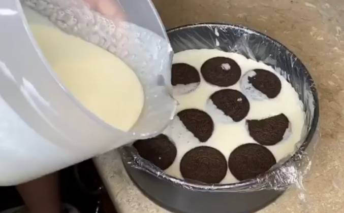 4. Достаём из холодильника форму с печеньем и выливаем на неё полученную массу. В середину также можно по желанию положить печенье орео. Убираем чизкейк в холодильник до полного застывания. Украшаем пожеланию. ⠀ Наш чизкейк готов! Приятного всем чаепития!Видео рецепт ютуб ниже 👇