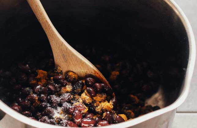 2. А пока добавьте высушенную черную фасоль в большую кастрюлю и добавьте тмин. Нагревать на среднем огне до образования пузырьков, часто помешивая - около 5 минут. Приправить по вкусу солью и размешать. Затем выключите огонь и отложите в сторону.