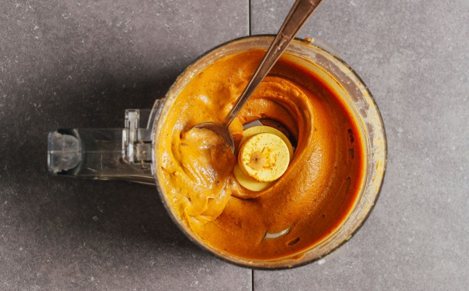 3. Чтобы приготовить сырный соус, добавьте сырые орехи кешью в кухонный комбайн и перерабатывайте в сливочное масло, соскребая его со сторон чаши по мере необходимости. Добавить специи и перец чипотли и перемешать до образования густого спреда. Затем добавляйте немного теплой воды и смешивайте, пока не образуется сливочно-растительный соус «кесо». Попробуйте и откорректируйте вкус по мере необходимости, добавив больше чипотного перца для остроты, тмина для дымности, соли для солености или пищевых дрожжей для сырного аромата. Отложить в сторону.
