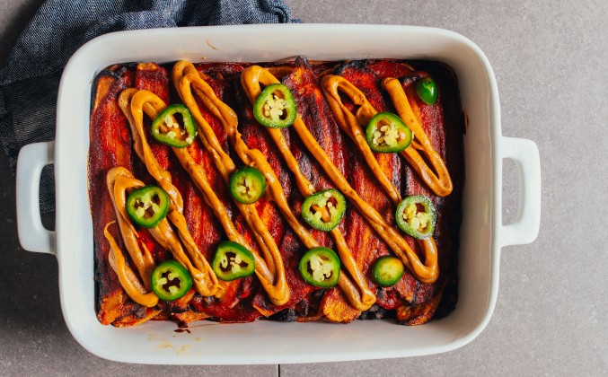 Вкусная овощная запеканка или энчилады с запеченными бананами, черными бобами, дымным соусом энчилада и квесто из кешью! Требуется всего 10 ингредиентов, сытных, ароматных и очень вкусных!