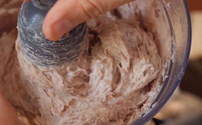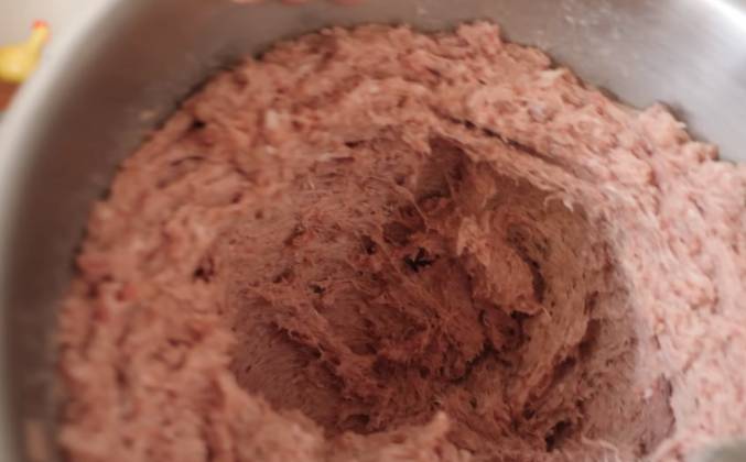 6. Сначала надо все до однородности перемешать. А затем частями, вот в этом агрегате буду превращать в эмульсию, добавляя ледяную воду именно ледяную и ли вообще лед. вот такая эмульсия на выходе. И вот так, частями готовлю эмульсию. И следите за температурой - не выше 12ти градусов- это просто как отче наш. Эмульсия готова, в колбу ее переложил можно набивать. Я это буду делать в колагеновую оболочку из этого же. Минского магазина эту оболочку предварительно замачивать не надо. Набиваем. не надо пытаться набивать очень плотно, при перевязке вполне можно добиться нужной плотности примерно так. Какую именно оболочку использовать - не важно - можно натуральную - ту же баранью череву, можно колагеновую, как я. Можно целюлозную - на ваш вкус.