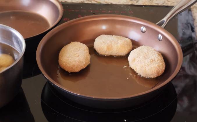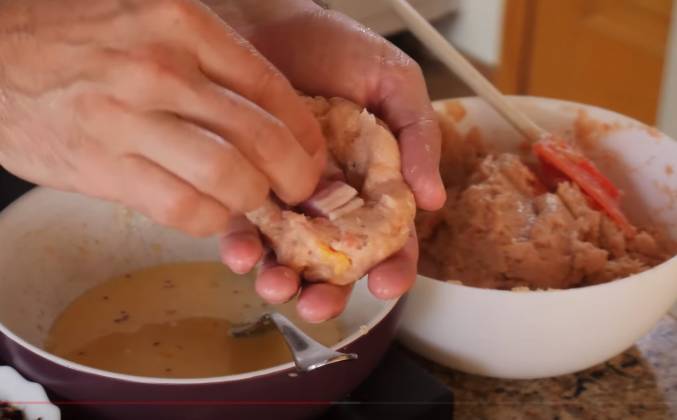3. Видите, он все молоко впитал. Остается добавить соль, перец и перемешать. Фарш готов грибы посолить и выключить нагрев... они тоже готовы. Можно приступать. На гарнир я хочу отварить молодой картошки пусть пока варится масло в сковороду - пусть греется. Надо смешать молоко и яйцо чтобы панировка как следует прилипала. Для нее я буду использовать панировочные сухари вот такие можно лепить котлеты. В эту грибы в льезон ее, затем в сухари, опять в льезон и опять в сухари. То есть слой панировки двойной на сковороду еще одну котлету с грибами сделаю. Следующая парочка будет с беконом и еще одну.